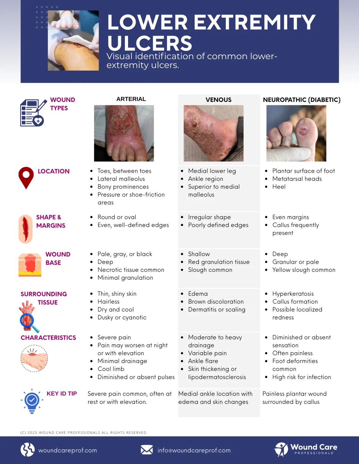 Identify arterial, venous, and neuropathic (diabetic) ulcers by location, appearance, and key clinical characteristics.