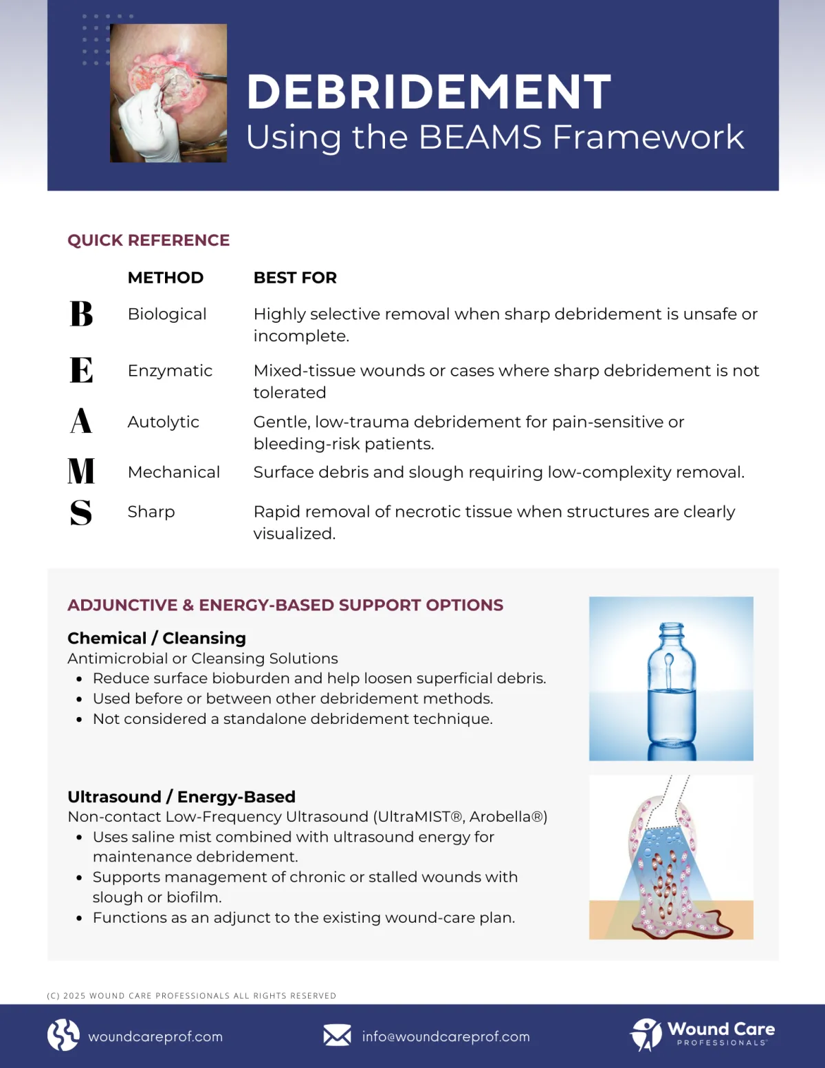 Overview of BEAMS debridement methods. Select the appropriate approach based on wound presentation, patient tolerance, and clinical goals.